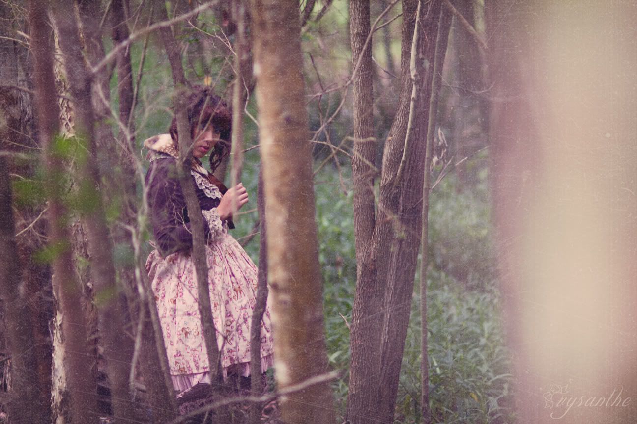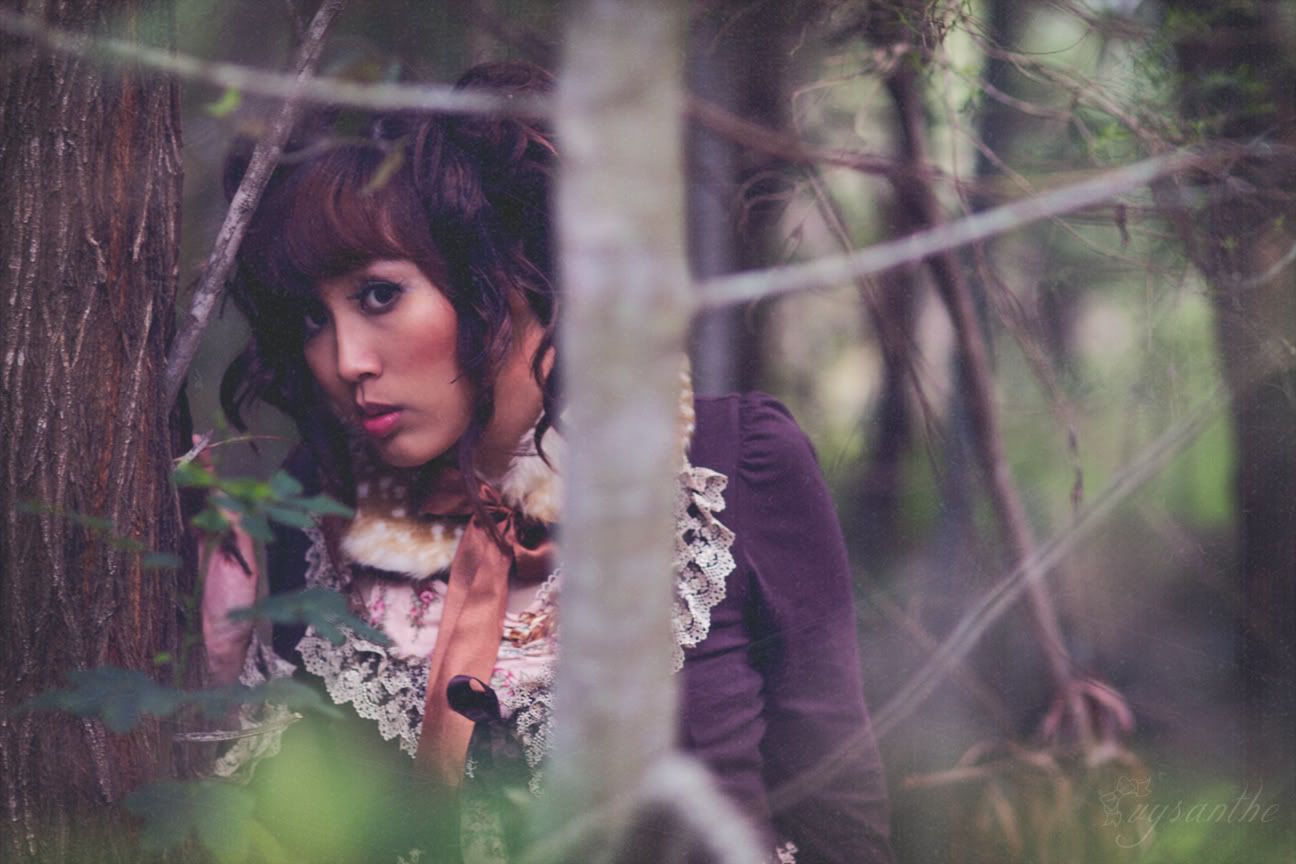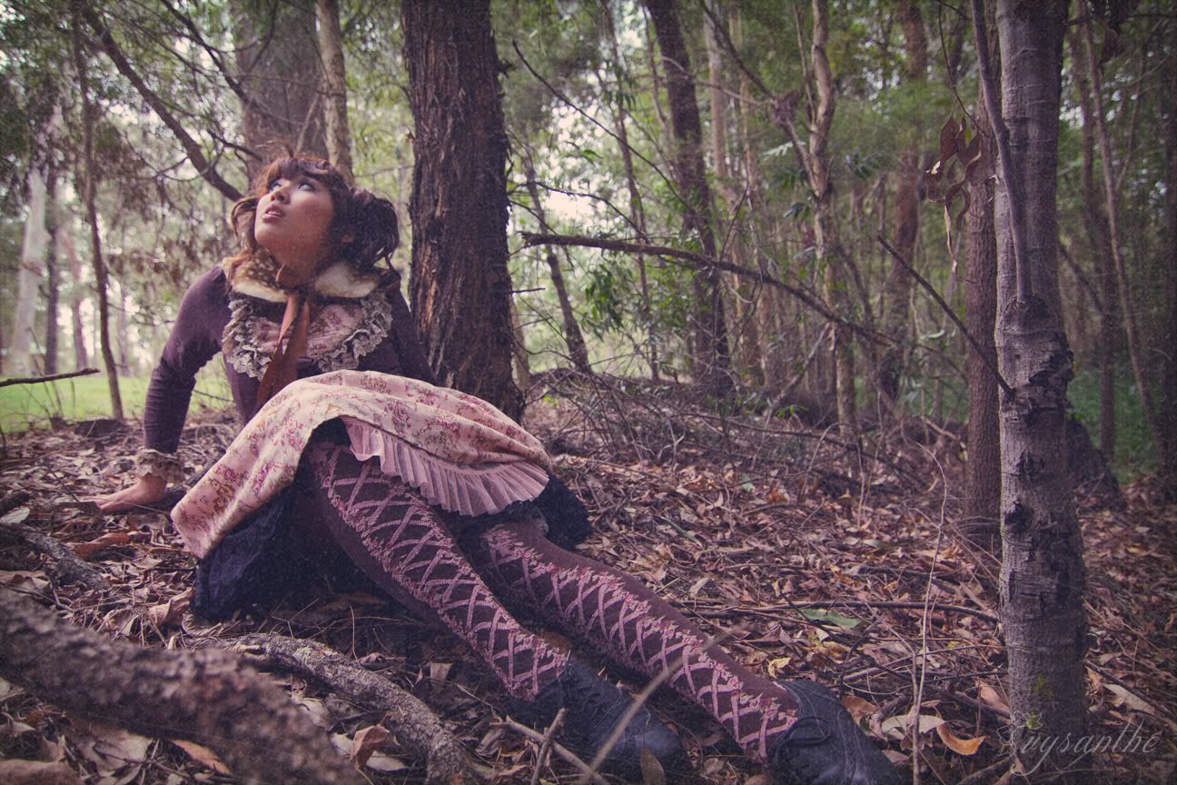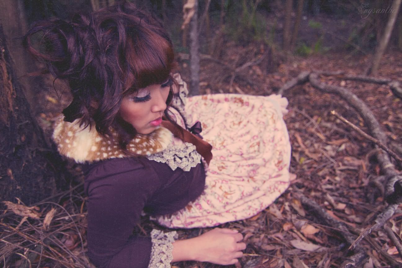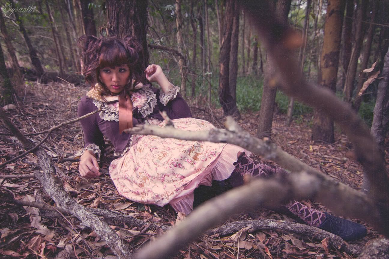 I wanted very dearly (:DDD) to shoot in a pine forest, but we haven't got nice ones in my state unfortunately... Though, deer DO live in this forest! We found them at 3am wandering on a nearby traffic island then galloping into the golf course near here! lol. The coordinate is pretty simple/maybe lacking accessories (but deer don't wear jewellery right?). Black shoes reminded me of hooves / I couldn't wear heels in that bushland.. XD Originally, technotropism and I were hoping to shoot Stag & Bambi but we couldn't figure out how to mount my antlers onto a head.. ideas?!!