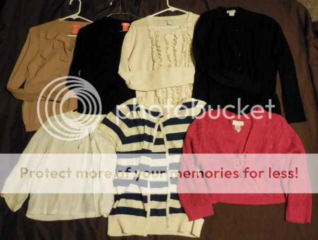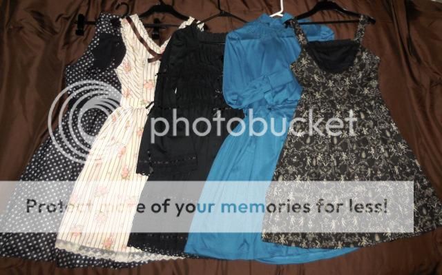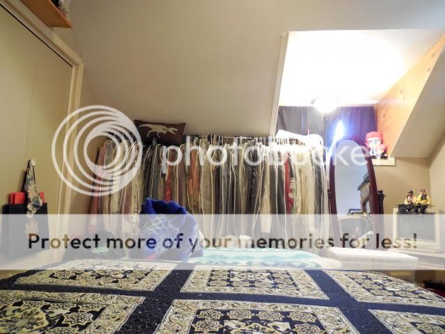 On the racks: dresses, skirts, blouses, boleros/cardigans, my fiance's jackets, vests, blouses... Petticoats in the garbage bag in the left corner.