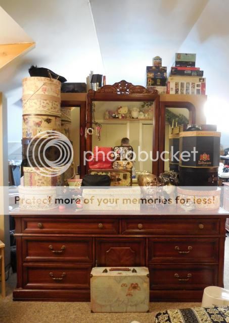 Hats and hair accessories in the hat boxes. The boxes in the middle (on top of the dresser): bottom is bloomers and flat-able bonnets (separated), and the one above it - OTK socks. The box on the floor is where I store my tights. The rest speak for themselves.