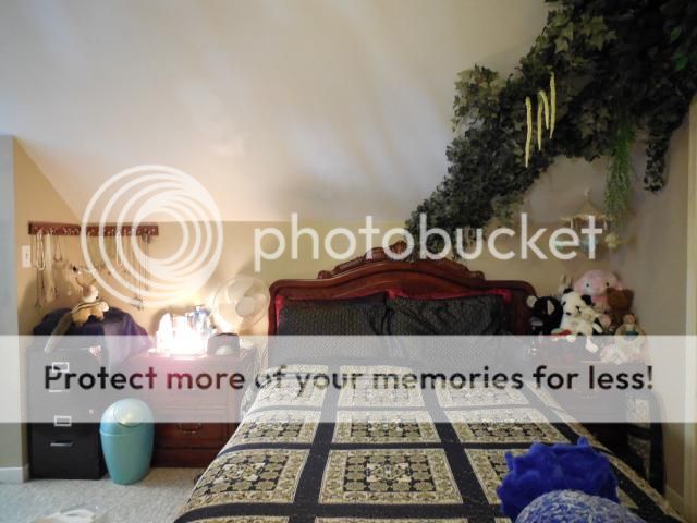 Necklaces on the walls on the left. Knee high socks are stored in one of the bedside drawers.